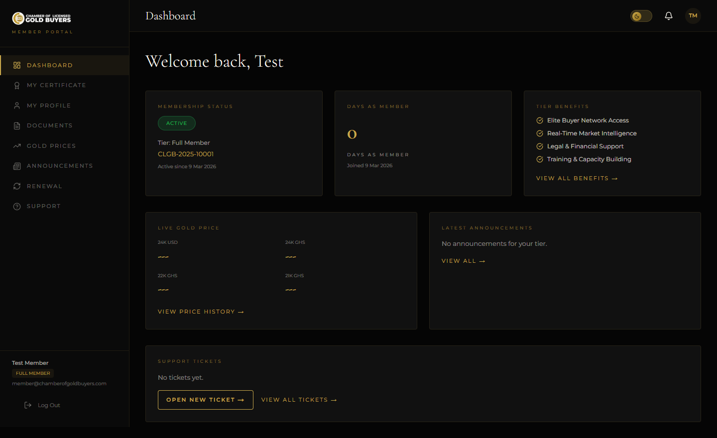 A full-stack web platform with a public-facing site, member portal and admin dashboard — where Ghana's gold trade meets global standards.